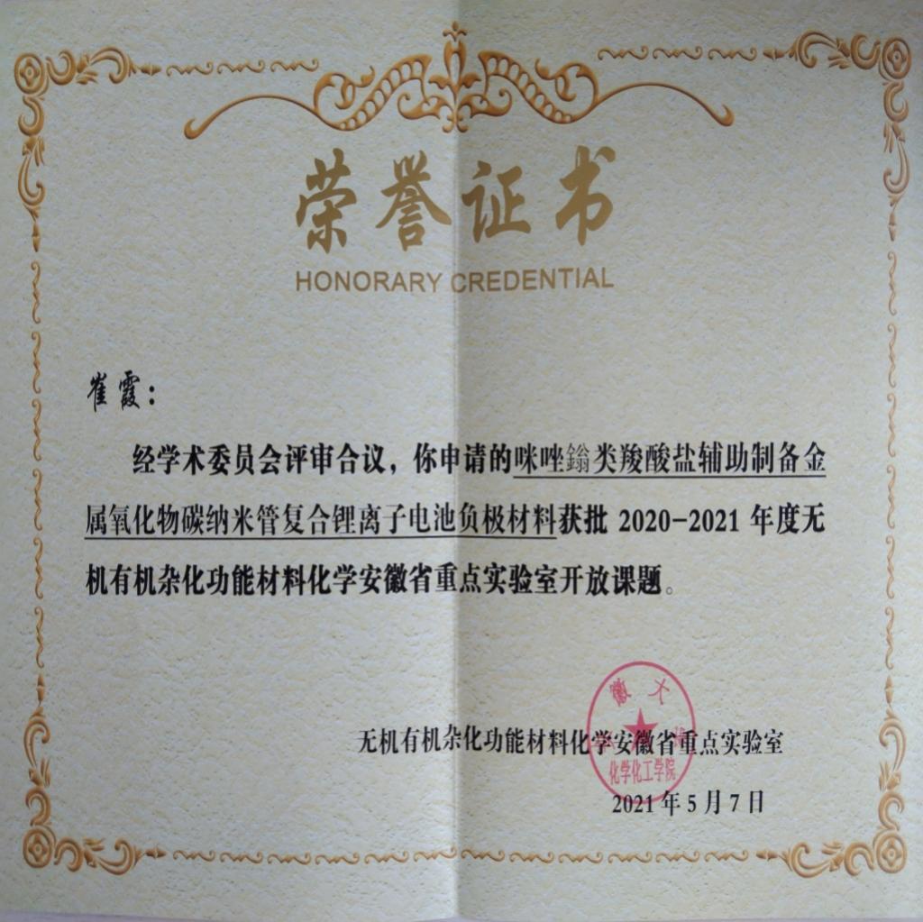 近日,据安徽省重点实验室通知,我校博士后研究中心团队崔霞、宋铂两位老师申请的无机有机杂化功能材料化学安徽省重点实验室开放课题已获批,并获得立项资助,资助经费为4万元,课题将在2021年5月至2023年4月期间执行。我校是本次立项开放课题唯一入围的职业院校。