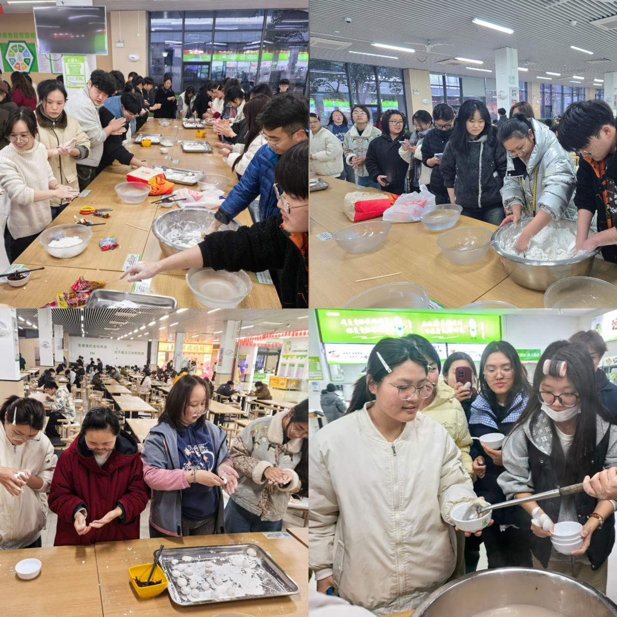 活动现场,同学们围桌而坐,揉面团、放馅料、搓圆子,分工协作、欢声笑语不断。大家从生疏到熟练,一颗颗圆润饱满的汤圆整齐排列,承载着团圆祝福与青春心意。现场氛围温馨热烈,既让同学们体验了传统民俗乐趣,也在协作互助中凝聚青春温情。
