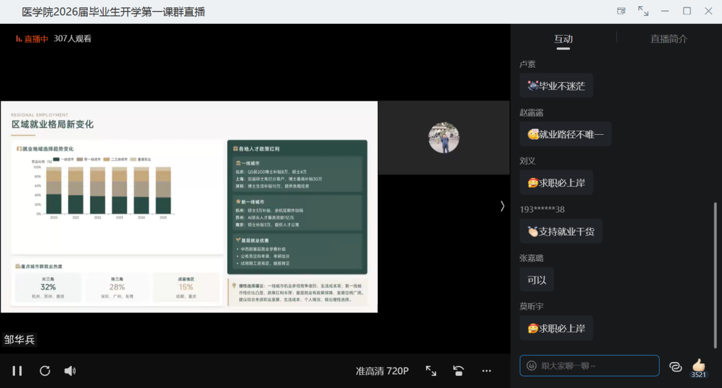 为扎实做好2026届毕业生就业工作,帮助毕业生认清就业形势、明确择业方向,3月11日晚,医学院党总支副书记(主持工作)邹华兵以“2026年就业形势分析与择业指导”为主题,为全体2026届毕业生讲授就业指导“开学第一课”,为毕业生求职择业精准导航。