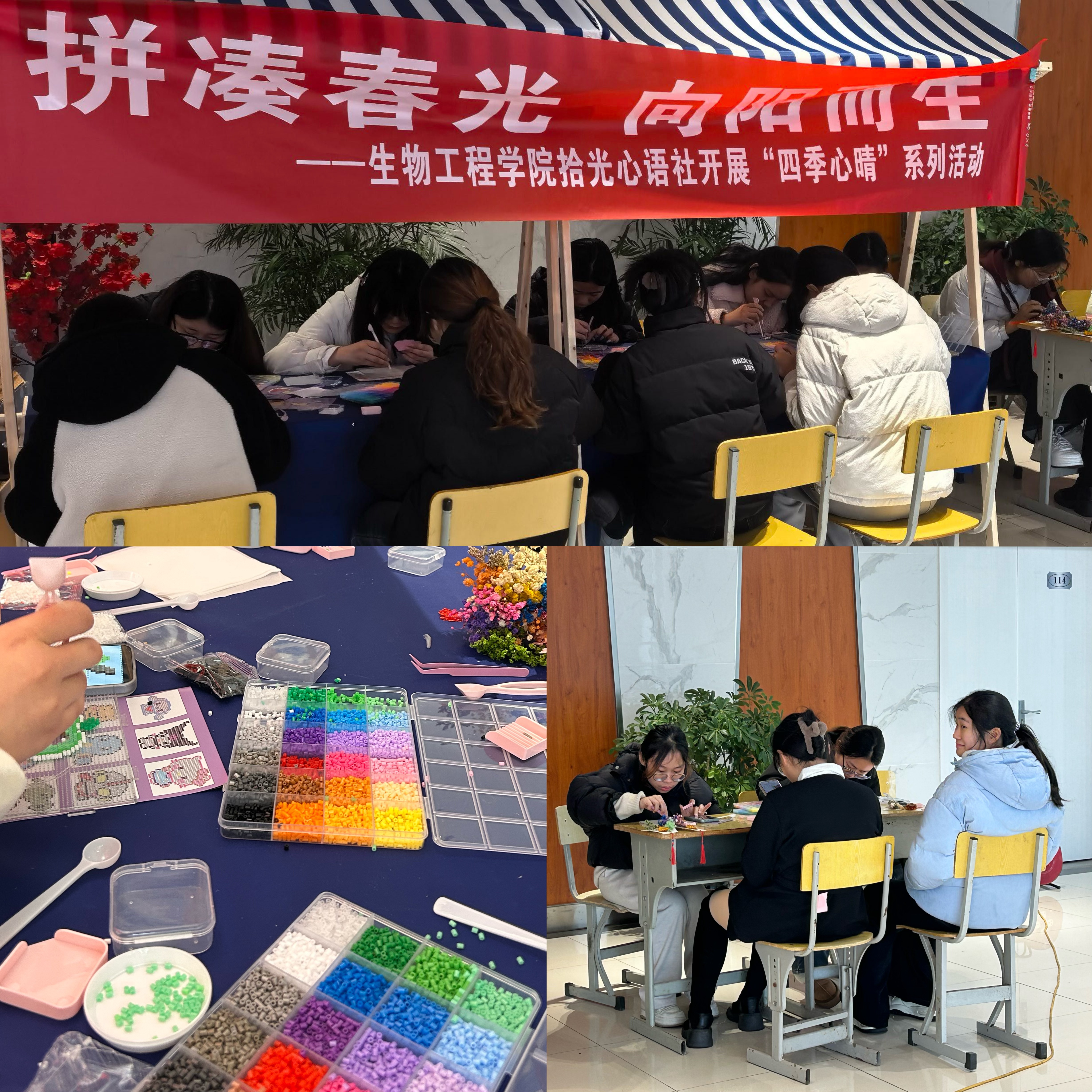 3月18日,该院接续推出春分主题 “拼凑春光 向阳而生” 拼豆DIY活动,吸引众多同学踊跃参与打卡。拼豆作为深受大学生喜爱的潮玩手工,兼具专注性与创造性。同学们在配色、拼接、熨烫成型的过程中,沉浸式投入创作,暂时放下学业与生活压力,在专注中获得内心平和,在完整成型的作品中收获成就感与心理圆满。