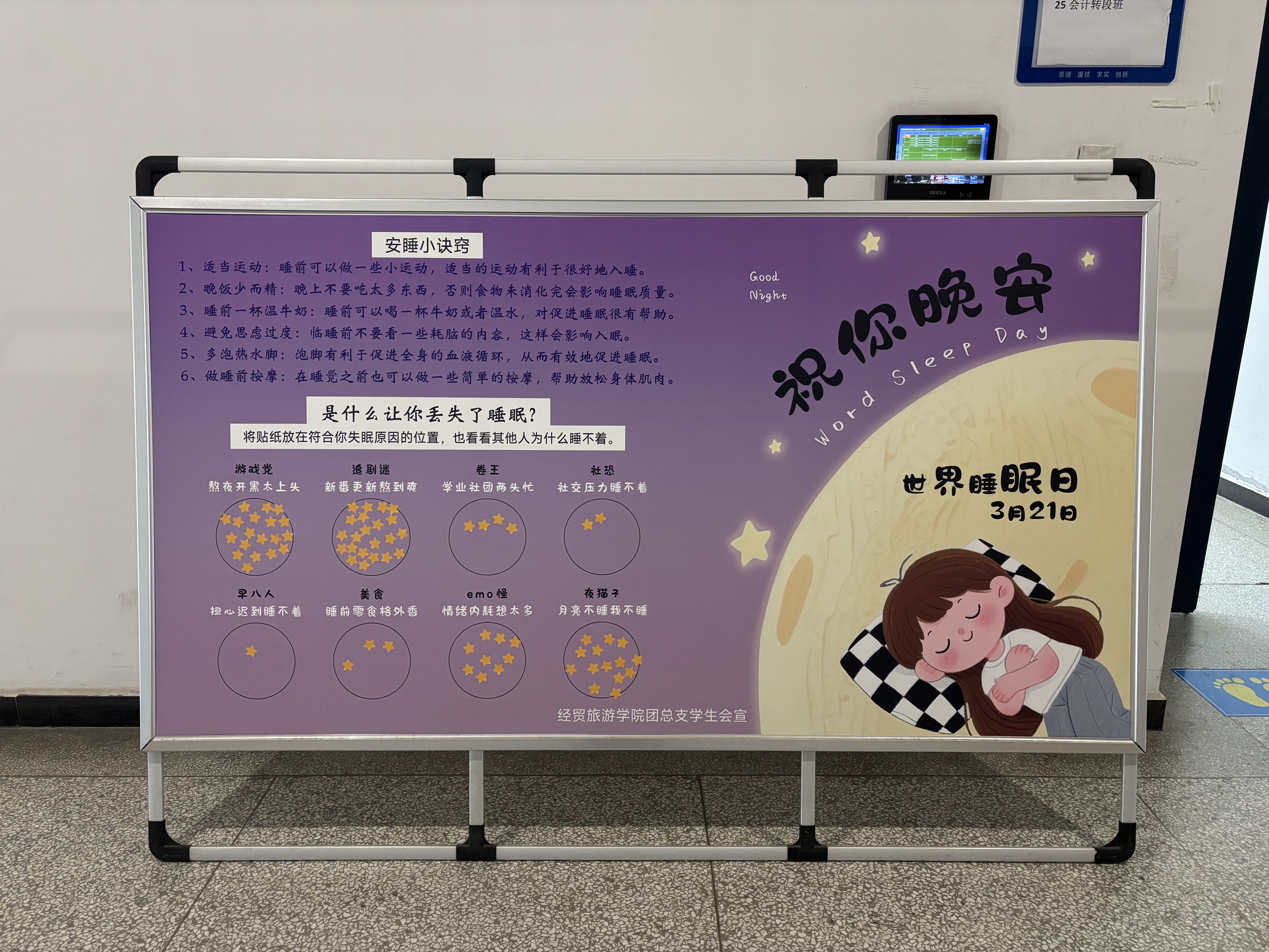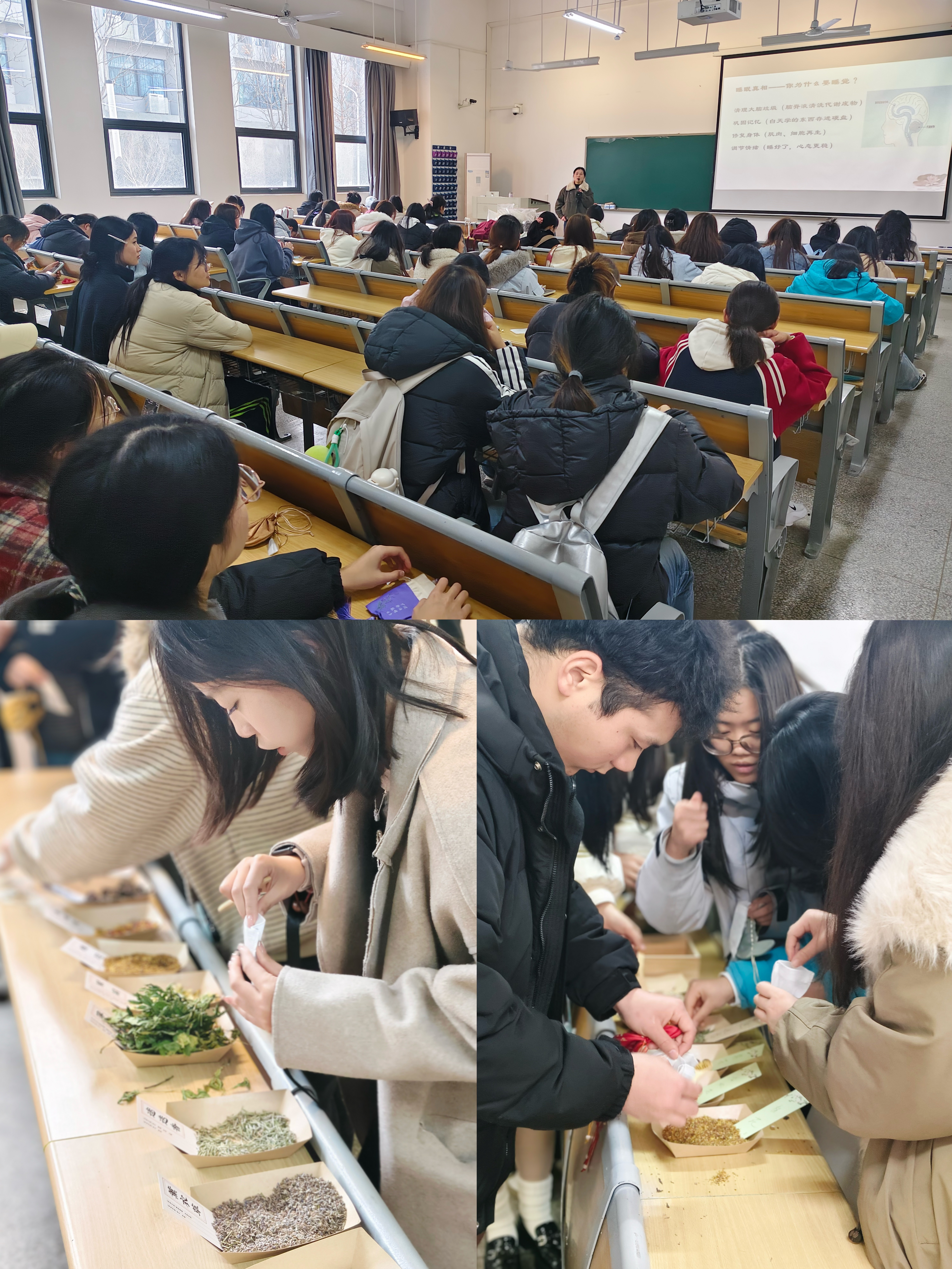 活动伊始,同学们参与了关于睡眠状况的互动调查,并在展板上留下自己的“睡眠小烦恼”。随后,大家领取空香包,有序入座,满怀期待地等待活动开始。