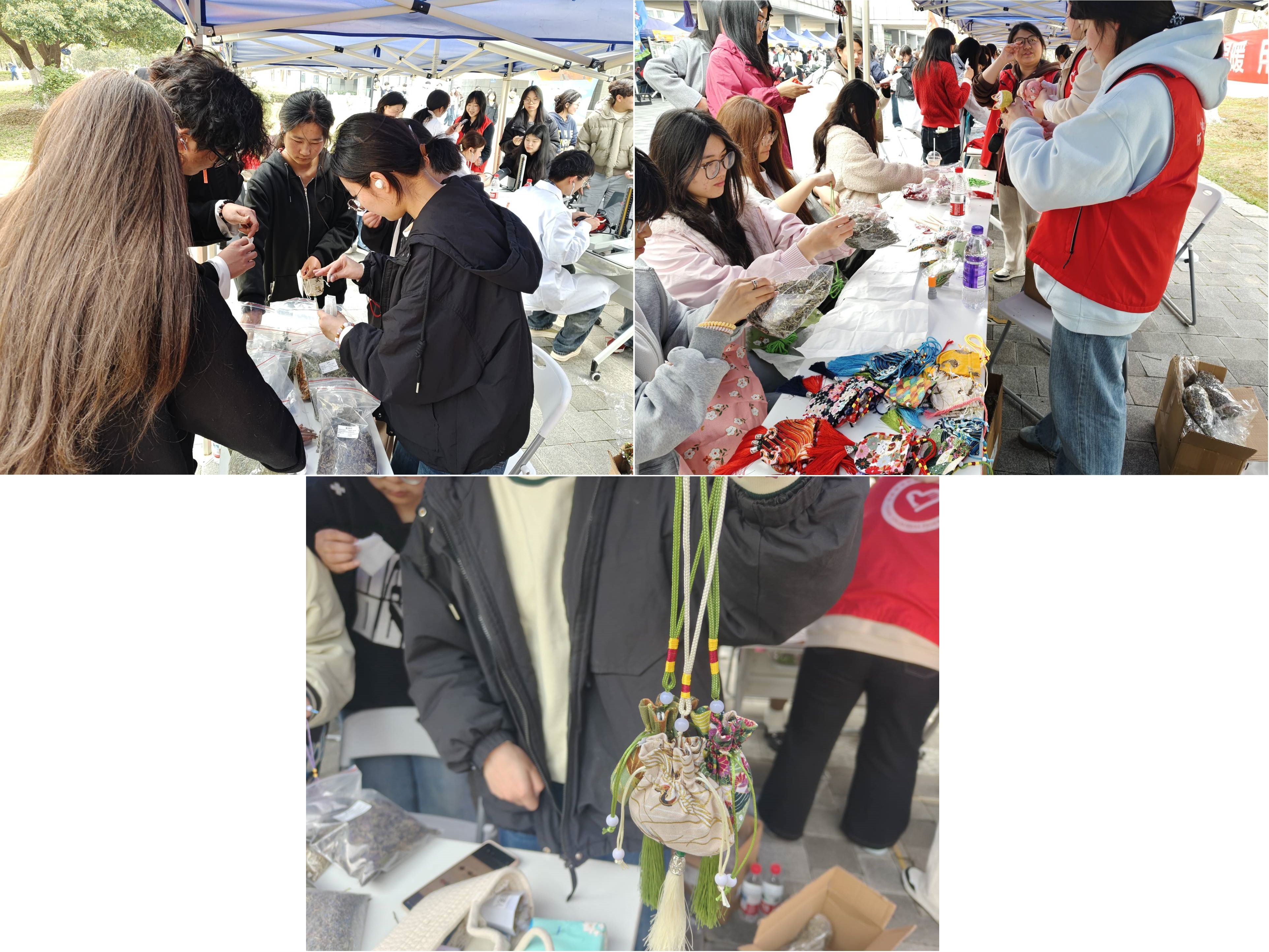 活动现场氛围热烈、秩序井然,其中中药香囊体验区尤为亮眼,成为全场最具人气的摊位之一。值得关注的是,该中药香囊摊位已多次亮相各类活动舞台,持续传递本草温情与志愿力量。现场配备了薄荷、丁香、藿香等多种芳香中药材,参与者通过回答中药知识即可亲手制作或兑换一枚中药香囊。小小香囊不仅造型精致、药香清雅,更兼具驱蚊防虫、提神醒脑等实用功效,让师生在动手体验中感受传统本草文化。艾草锤体验制作同样人气十足,志愿者们准备好粗布、艾草包、木棍等材料,耐心讲解艾草的药用价值和艾草锤的养生原理。师生们在志愿者手把手指导下,填充艾草、固定木柄、缠绕彩绳,制作出一个个药香扑鼻的养生锤。大家互相敲打肩颈,体验传统中医养生智慧,现场气氛温馨热烈,不仅让师生们体验到了手工制作的乐趣,更传递了健康的生活理念。