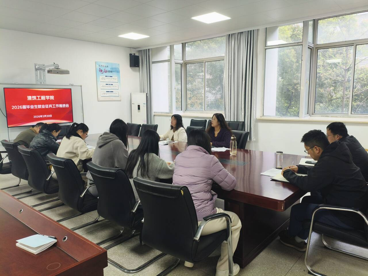 为全面落实国家关于高校毕业生就业和征兵工作的重要指示精神,扎实推进建筑工程学院2026届毕业生就业创业与征兵入伍各项工作,3月30日,建筑工程学院在建工楼213会议室召开2026届毕业生第一次就业征兵工作推进会议。该院党总支副书记(主持工作)丁怡琴、就业工作负责人、征兵工作负责人及全体毕业班辅导员参加会议,会议由该院党总支副书记施芳芳主持。