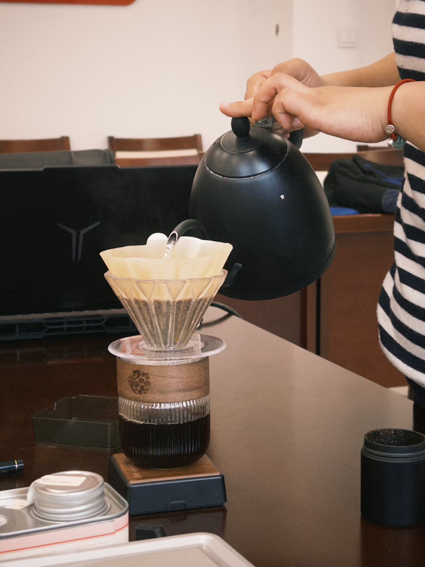 在读书分享之余,程沅君老师为同学们带来了专业的手冲咖啡体验指导。程沅君细致讲解了手冲咖啡的原理、器具使用、水温控制与萃取技巧,从研磨咖啡豆、温杯滤纸,到注水焖蒸、分段萃取,每一个步骤都耐心示范、悉心指导。同学们亲手操作,在水流与咖啡粉的碰撞中,感受咖啡从生豆到醇香的奇妙转化,在动手实践中体会慢生活的惬意与美好。温热的咖啡、浓郁的香气,为这场读书盛宴增添了别样的温暖与仪式感,让师生在忙碌的学习工作中,寻得一份宁静与松弛。