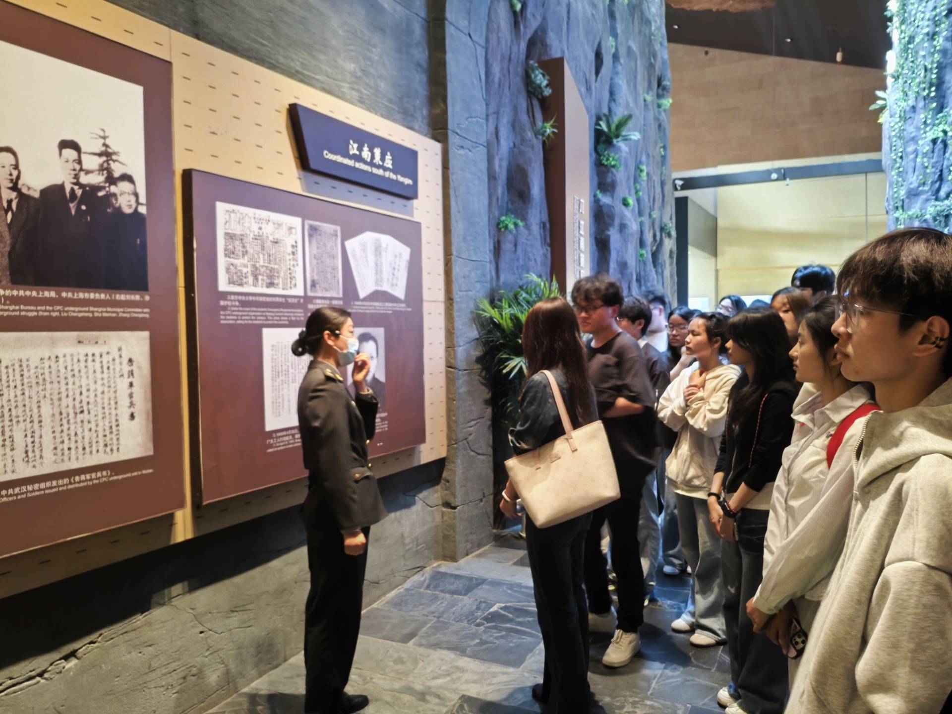 车辆首先抵达渡江战役纪念馆。这座屹立于巢湖之滨、犹如一艘乘风破浪战舰的宏伟建筑,瞬间将全体师生带回了那段峥嵘岁月。在纪念馆内,全体师生沿着习近平总书记在合肥考察时的足迹,依次参观了“战前形势”“战役准备”“突破江防”“战役胜利”等展厅。通过瞻仰2500余件珍贵的历史文物、观看全景式沉浸影像以及聆听讲解员深情的讲述,百万雄师“打过长江去,解放全中国”的壮阔画卷在大家眼前徐徐展开。