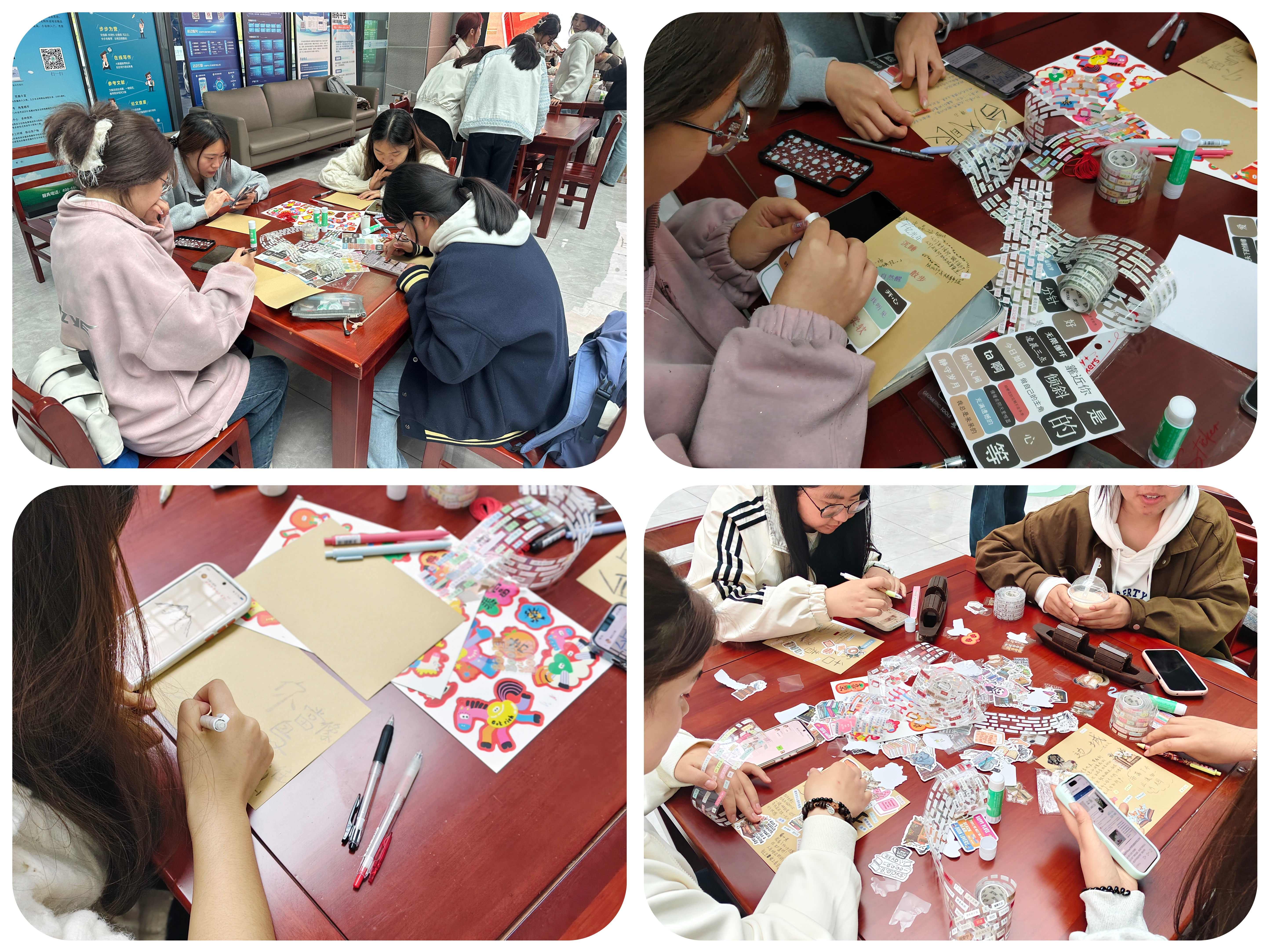活动现场氛围温馨雅致,处处洋溢着书香与文化气息。在读书手帐制作环节,同学们带着自己喜爱的书籍,精心挑选素材、搭配色彩,将阅读中的感悟心得、经典好句、书中插画等记录在手帐之中。大家发挥创意、精心排版,用文字与画笔定格阅读美好,把碎片化的阅读感悟转化为精致独特的手帐作品,在动手创作中深化阅读记忆,让读书变得更有仪式感,进一步激发了持续阅读的热情。