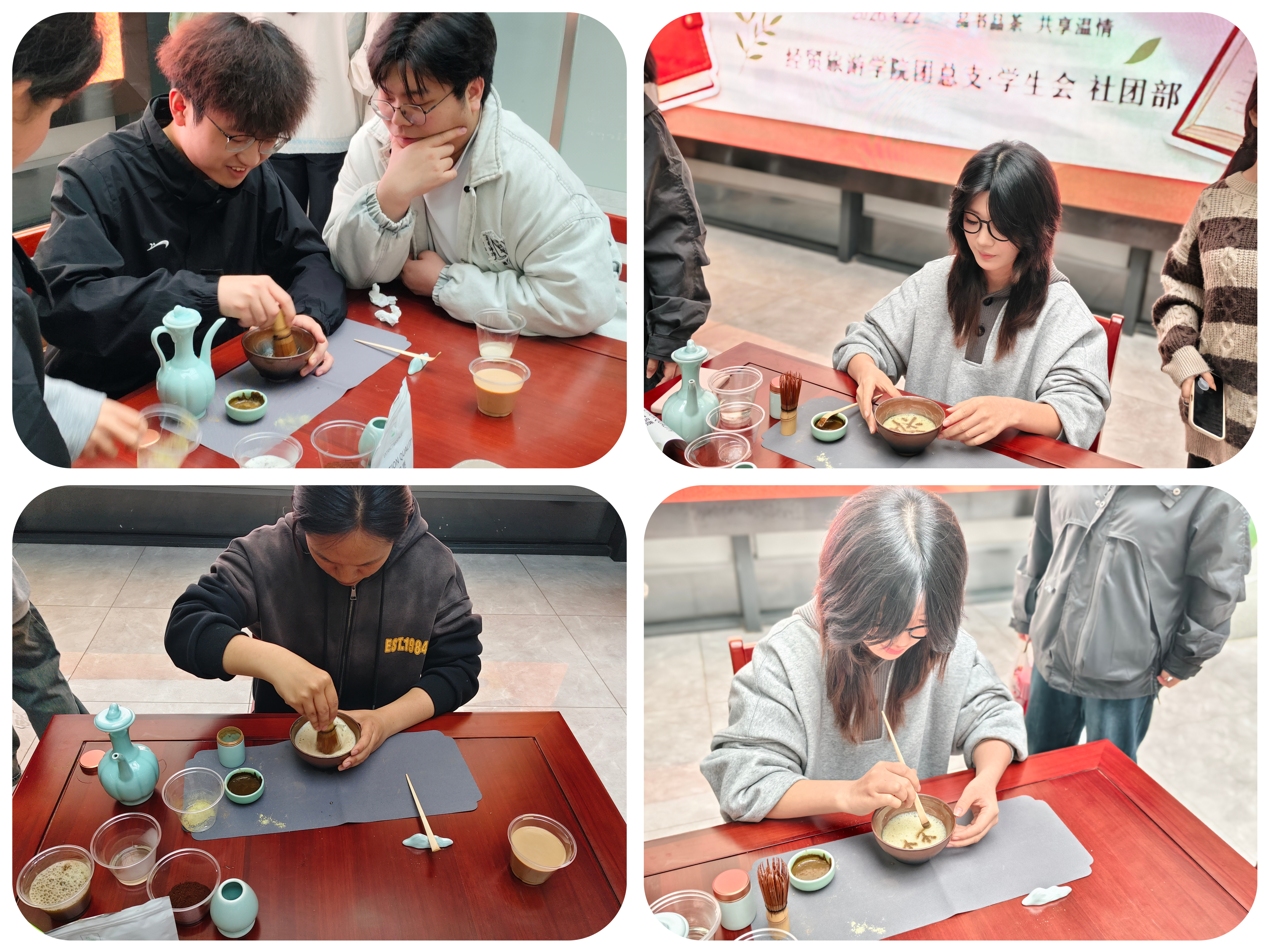 最具传统文化韵味的当属非遗点茶工艺体验环节。非遗点茶作为中华传统茶文化瑰宝,承载着深厚的历史文化底蕴。活动特邀该院图南社泼茶香茶学小组同学现场示范非遗点茶的流程与技法,从调膏、击拂到茶汤成型,细致讲解每一个步骤的要领。同学们凝神专注,亲手体验点茶工艺,手执茶筅击拂茶汤,感受传统茶艺的雅致与精妙,在沉浸式体验中领略非遗文化的博大精深,增强对中华优秀传统文化的认同感与自豪感。