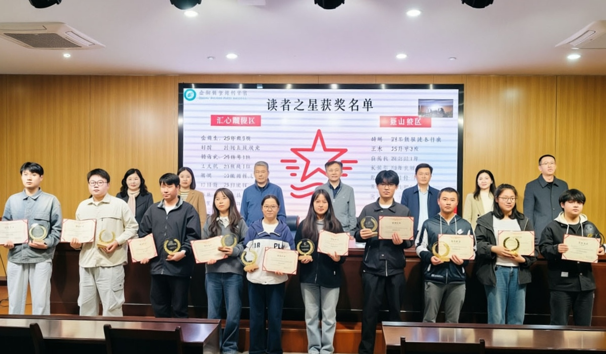 随后,两校区同步举行了2025年度“读者之星”颁奖仪式。与会领导分别为汇心湖校区和鼓山校区借阅量排名前十的同学颁发荣誉证书和奖杯,并合影留念。荣获本届“读者之星”第一名的机电工程学院25机械3班金永笙同学作为学生代表上台发言,分享了个人在图书馆徜徉书海的阅读心得与成长感悟。