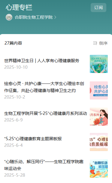 “心晴四季”科普活动:传播知识,提升心灵素养。同日,合职院生物工程学院公众号心理专栏推出第11篇科普推文“寒露至 心渐暖”。推文以“寒露”节气为切入点,为同学们提供了科学的心理健康知识,帮助大家了解秋季可能面临的心理问题及应对方法,让大家认识到,关注心理健康不仅关乎个人成长,更是对社会的一份责任,展现出新时代大学生服务他人、奉献社会的担当。