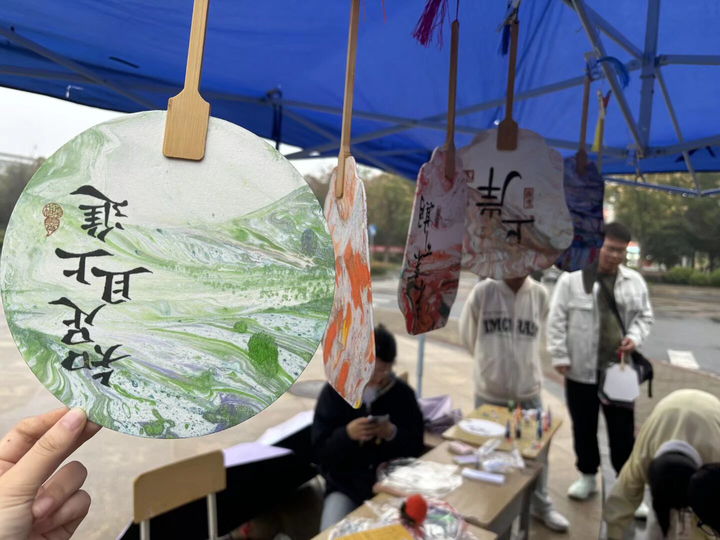 二食堂门口的 “非遗漆扇DIY” 成为焦点,同学们在志愿者指导下体验 “漂漆” 技法,将大漆滴入水中形成纹理,再提扇定格独一无二的纹路。大一新生周同学手持漆扇兴奋地说:“每把扇子都是孤品,就像我们的青春!”