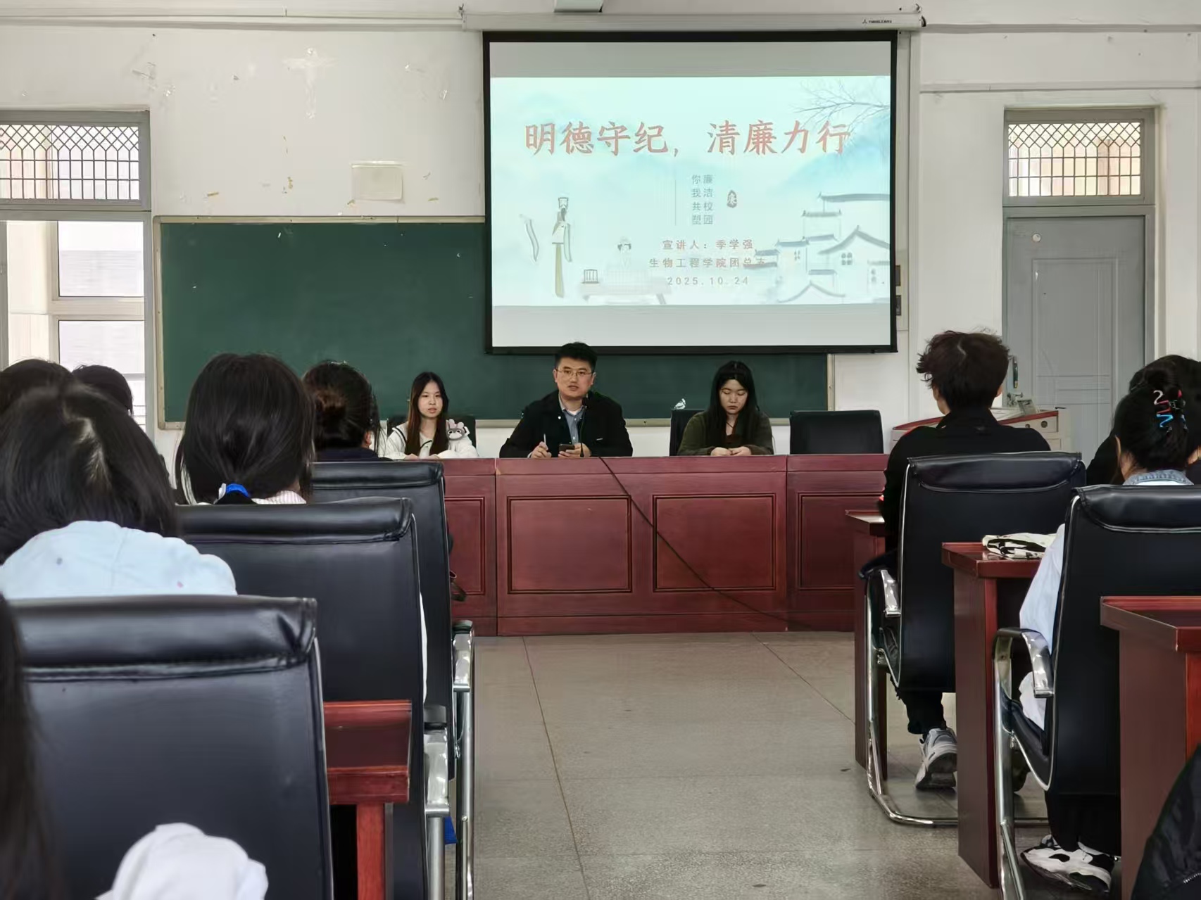 为深入推进廉洁文化建设,增强我校学生的廉洁意识和自律精神,生物工程学院团总支于10月24日在生化楼A305会议室开展了“明德守纪 清廉力行”主题团课。本次团课由该院团总支书记季学强老师主讲,所有2025年下半年入团积极分子参加。