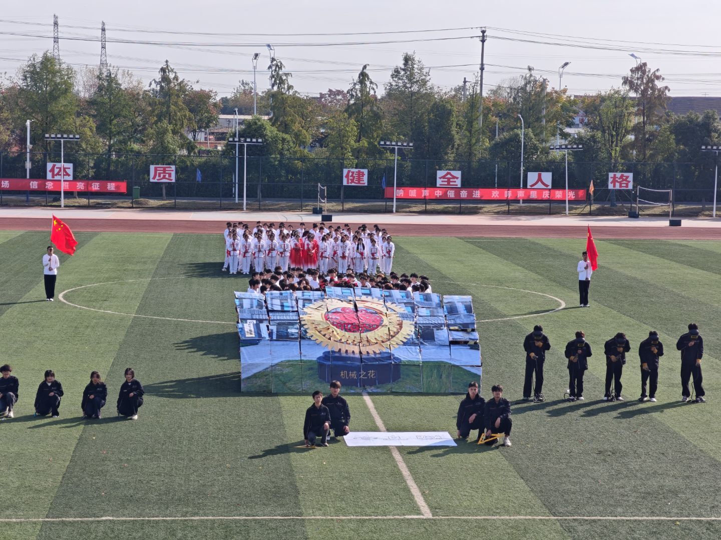 开幕式上,机电工程学院的入场表演成为全场瞩目的焦点。当整齐划一的方阵走过主席台后,绽放出一朵结构精巧、寓意深远的“机械之花”。这朵独特的“花朵”不仅巧妙融合了齿轮、扳手等工业元素,更象征着机电工程学院严谨求精的工匠精神与创新活力。紧接着,由同学们带来的舞蹈《美丽中国》,用充满力量与美感的舞姿,演绎出山河壮丽、时代奋进的画卷,展现出该院学子的艺术情怀与家国担当。