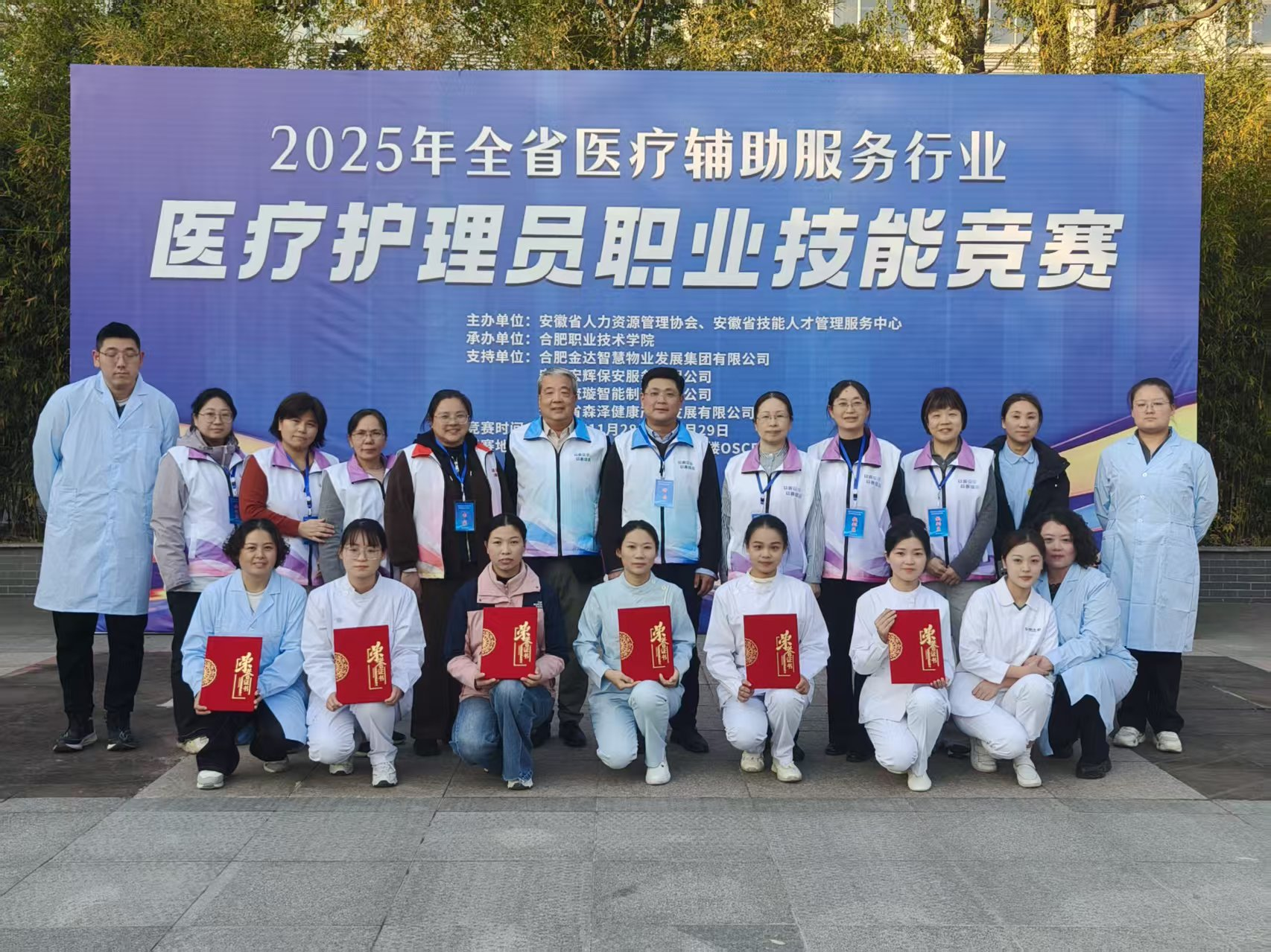 11月29日,2025年安徽省医疗辅助服务行业医疗护理员职业技能竞赛在合肥职业技术学院顺利收官。本次竞赛由安安徽省人力资源管理协会、安徽省技能人才管理服务中心主办,我校承办,既是对全省医疗护理员技能水平的一次全面检阅,更是落实“技能成才、技能报国”理念的具体实践。竞赛以“提升专业技能、规范服务标准、赋能民生保障”为宗旨,通过理论与实操双重考核,全面检验全省医疗护理员队伍的专业素养,为行业高质量发展注入强劲动力。