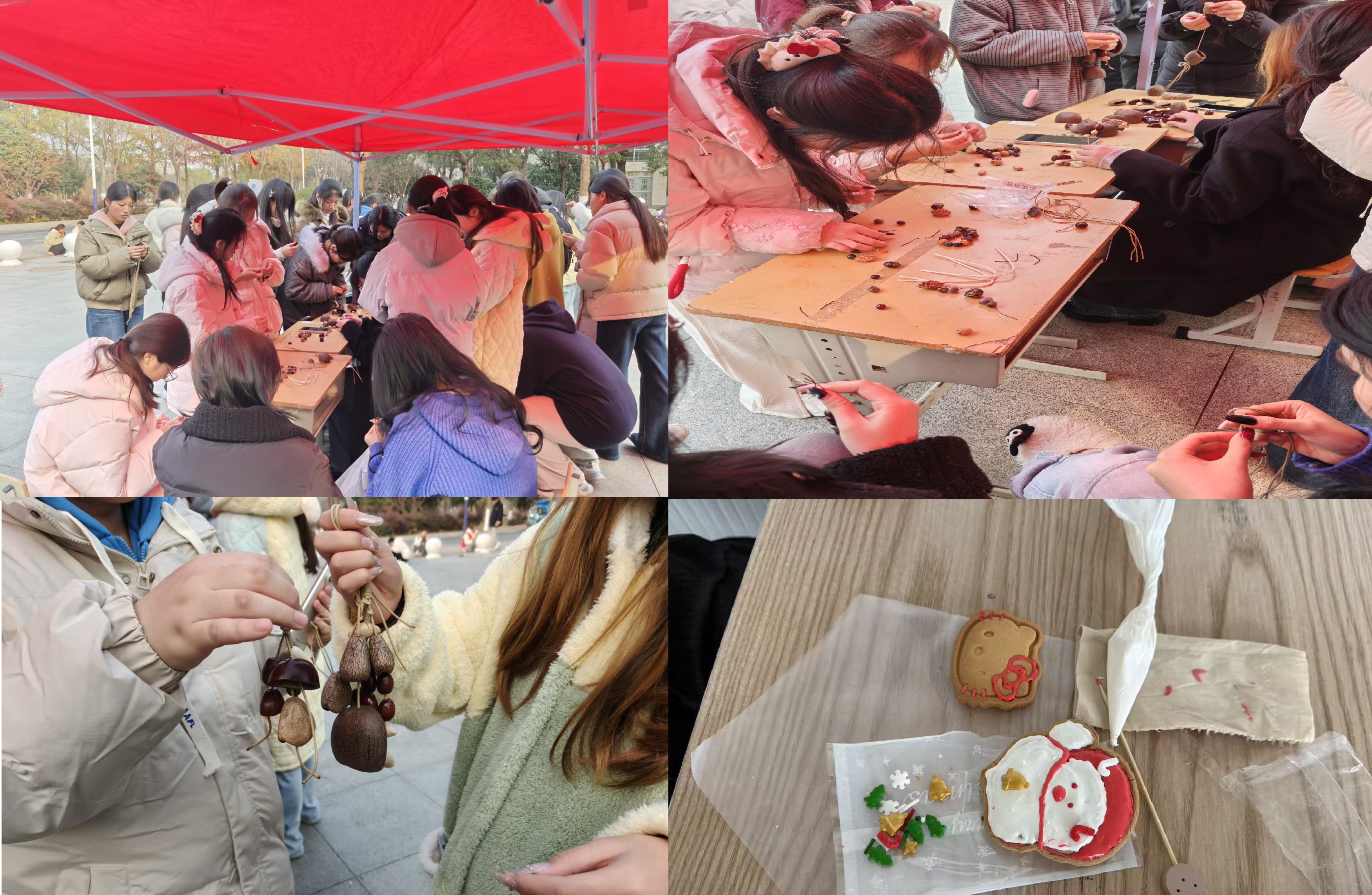 创意手工,拾趣青春。魔幻烘焙社和药海拾贝社分别开展糖霜狂欢节与果壳风铃制作活动,在一食堂食品加工中心,糖霜狂欢节活动拉开帷幕,学子们从面团塑形起步,尝试精细裱花与创意调色,将糖霜的灵动与烘焙的趣味完美结合。大家以小组为单位协作创作,在涂抹、裱花的过程中摸索技巧,一件件造型别致的糖霜饼干相继完成;一食堂前广场的“拾壳赋音,巧制奇响”活动同样精彩,相关负责同学先讲解中药材的特点与文化寓意,再演示果壳风铃制作步骤,同学们巧用果壳、麻绳、中药材等材料,通过清洁、装饰、组装等环节,将普通果壳转化为独具创意的风铃,切身感受“变废为宝”的环保理念。