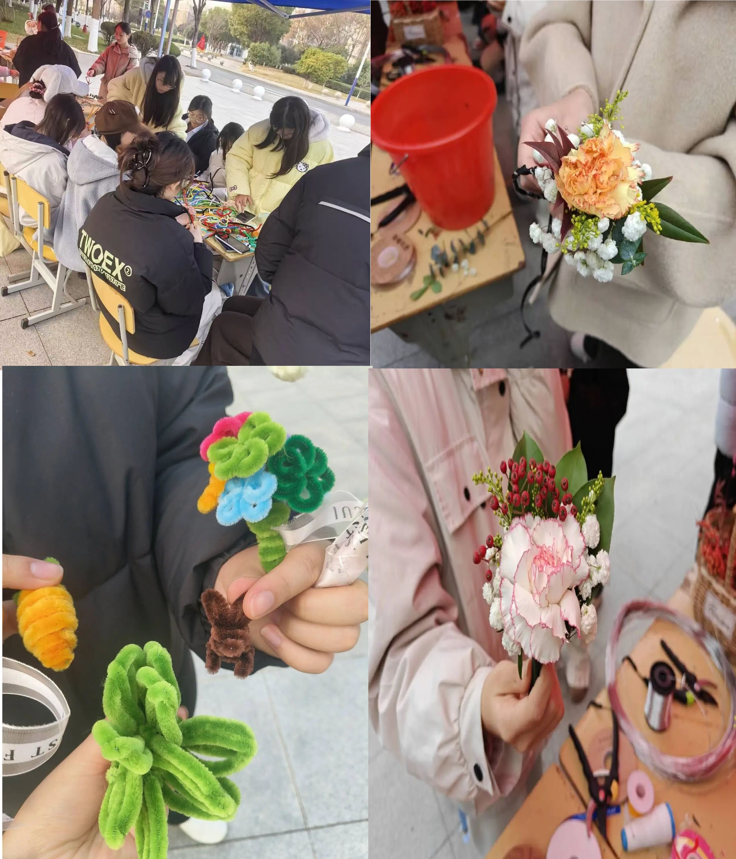 指尖生花,共赴冬约。织情花艺社和四季心晴社在一食堂前广场共同举办充满趣味的手腕花DIY活动,相关负责同学围绕手腕花的文化背景展开讲解,详细介绍清新自然、复古优雅、冬日森系等风格特点与色彩搭配技巧,同时结合实物展示,让大家直观感受花艺之美。相关负责同学按照花材处理、主花定位、配花搭配、胶带固定、丝带装饰的步骤拆解制作流程,强调操作与安全要点。同学们通过亲手挑选和搭配各种美丽的花卉,设计出独一无二的手腕花作品,感受花卉的美好,展现个性和品味,让青春在花香中绽放。
