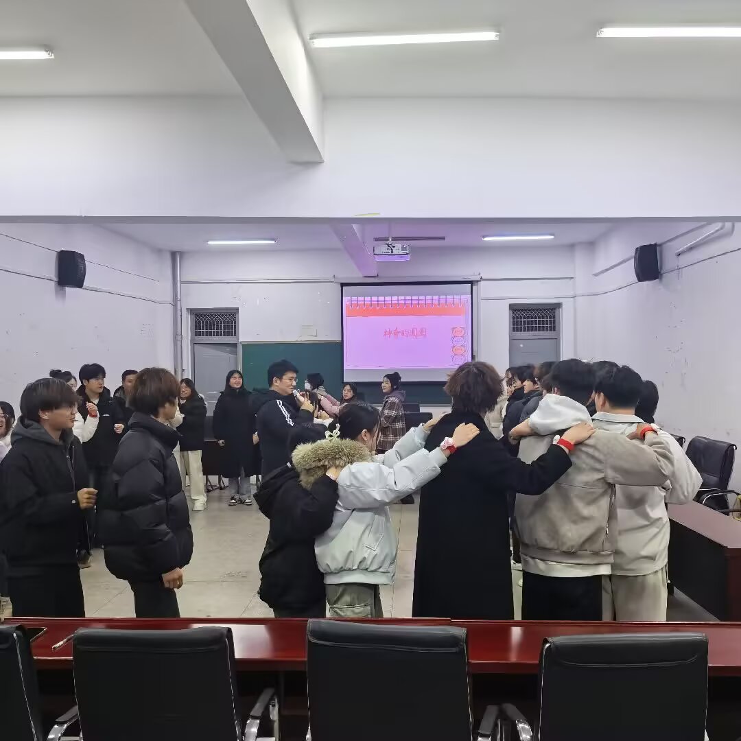 活动共设五个环节,层层推进。破冰环节,同学们手拉手围成“一个神奇的圆圈”,为身旁伙伴捏肩捶背,在轻松的互动里卸下疲惫;“大风吹·小风吹”迅速点燃现场氛围,大家闻声而动,欢笑声此起彼伏;“桃花朵朵开”考验快速组队能力,同学们在奔跑与集结中拉近彼此距离;“同舟共济”环节则要求小组全员站在有限的“船”上保持平衡,大家群策群力、相互扶持,充分展现团队智慧与凝聚力。活动尾声,同学们提笔在贺卡上写下真挚祝福,同时郑重许下新一年的成长期许,字里行间满是对未来的憧憬与信心。