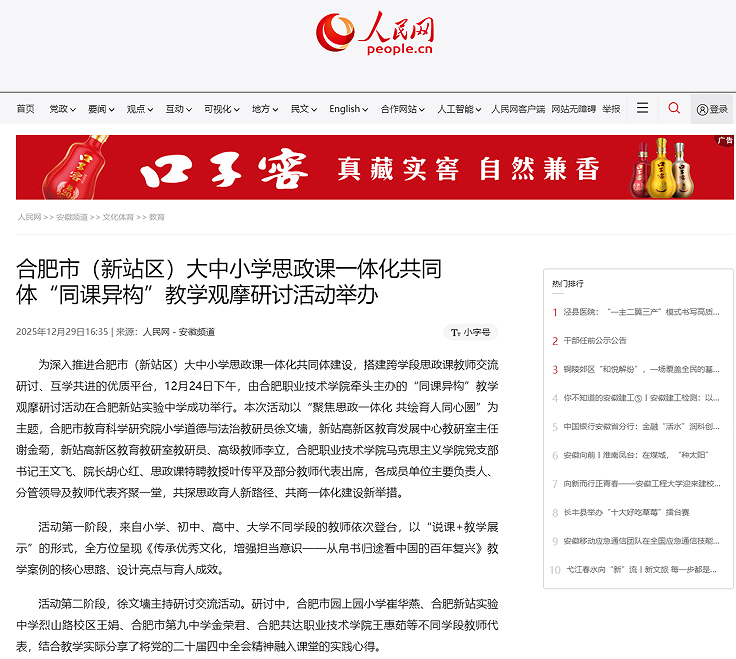 打造“行走的思政课”品牌:该院通过“走讲做悟”闭环管理和“双师协同”言传身教,双轮驱动保障“行走”行稳致远。通过“红色传承、改革溯源、文明寻根、法治筑安、职教匠心”五大路径构建社会大课堂。2025年组织学生赴肥西县小井庄、渡江战役纪念馆、李克农故居、安徽省法治宣传教育基地、巢湖市中李国家安全教育馆和凌家滩遗址博物馆等地开展实践教学活动6场,其中2篇新闻在人民网宣传报道,为落实立德树人根本任务提交了富有特色的年度答卷。