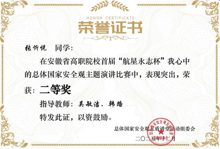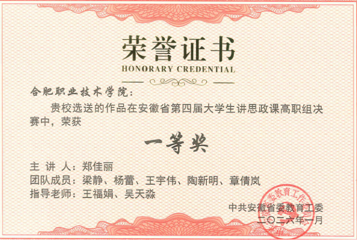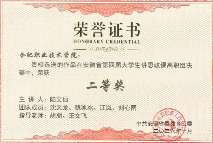 在安徽省第四届“大学生讲思政课”比赛中,斩获省赛一等奖1项、二等奖1项,4位老师荣获“优秀指导老师”。在安徽省高职院校首届“航星永志杯”总体国家安全观主题演讲比赛中,斩获二等奖1项,2位老师荣获“优秀指导教师”称号,我校被大赛组委会授予“最佳组织奖”。该院教师韩路代表合肥第二开放大学获得安徽开放大学首届教师教学创新暨课程思政教学大赛决赛一等奖。该院教师陈力参加2025年新站区高校思想政治理论课教学联盟思政课教学展示与观摩活动荣获三等奖。上半年组建2支队伍参与2025年度校级教学能力大赛,下半年组建4支队伍备赛2026年度校赛,最终有3支队伍进入校级决赛。