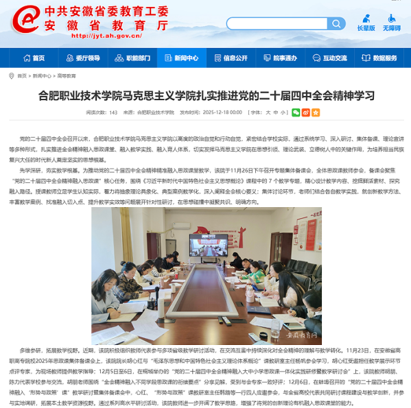 加强政治建设:2025年该院开展集中理论学习12次,专题党课4次,交流研讨15人次,先后赴红色教育基地开展实践教学活动6次。夯实组织建设:2024年该院获评市管院校四星级党支部,2025年党支部召开支委会20次、党政联席会23次、党小组会议12次。加强思想建设:严格落实“第一议题”制度,加强思想理论武装。围绕党的二十届四中全会精神第一时间开展专题集体备课,先后8位教师赴桐城、蚌埠等地参加省市级层面党的二十届四中全会精神集体备课会。全年共刊发76篇新闻稿,其中6篇在人民网、安徽省教育厅网站宣传。